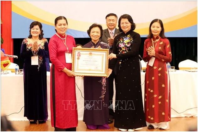 Phó Chủ tịch nước Đặng Thị Ngọc Thịnh trao Huân chương Lao động hạng Ba cho Hội Bảo vệ quyền trẻ em Việt Nam tại Đại hội. Ảnh: Anh Tuấn/TTXVN