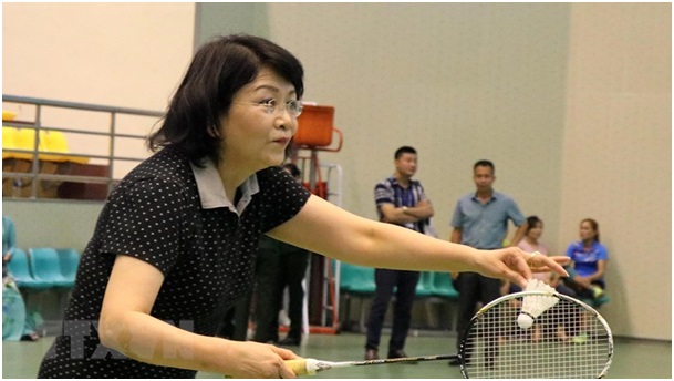 Phó Chủ tịch nước Đặng Thị Ngọc Thịnh tham gia thi đấu giao hữu môn cầu lông. (Ảnh: Diệp Trương-TTXVN)
