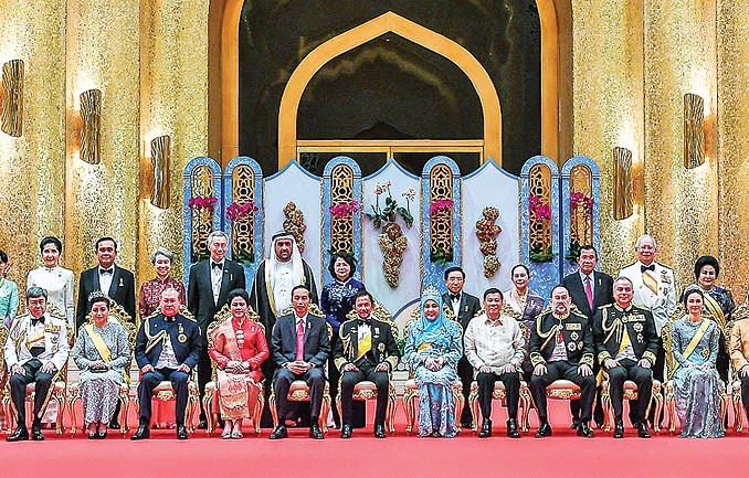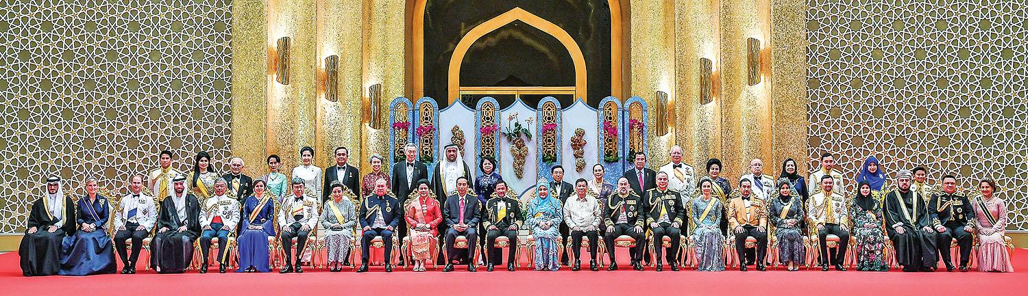 Quốc vương Brunei Hassanal Bolkiah và Hoàng hậu cùng thành viên hoàng gia chụp ảnh lưu niệm với Phó Chủ tịch nước Đặng Thị Ngọc Thịnh và lãnh đạo cấp cao các nước