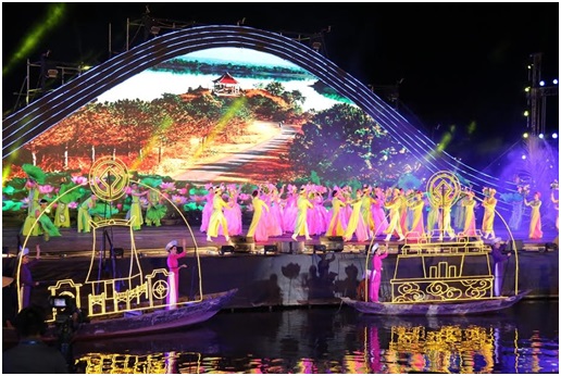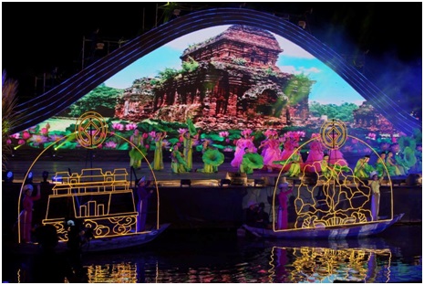 Sân khấu được dựng ngay trên sông Hoài, với hệ thống ánh sáng, trình chiếu hiện đại. (Ảnh: Báo Quảng Nam)