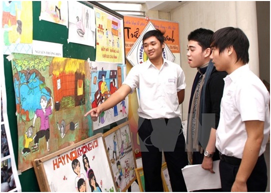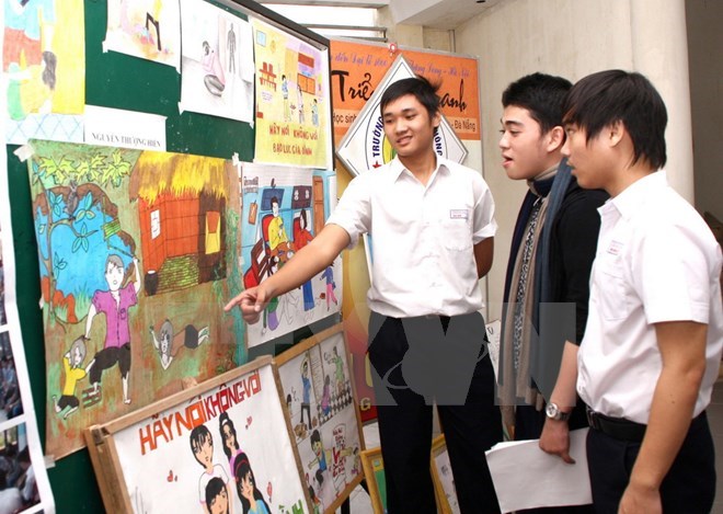 Học sinh tìm hiểu cách phòng chống bạo lực gia đình qua tranh ảnh. (Ảnh: TTXVN)