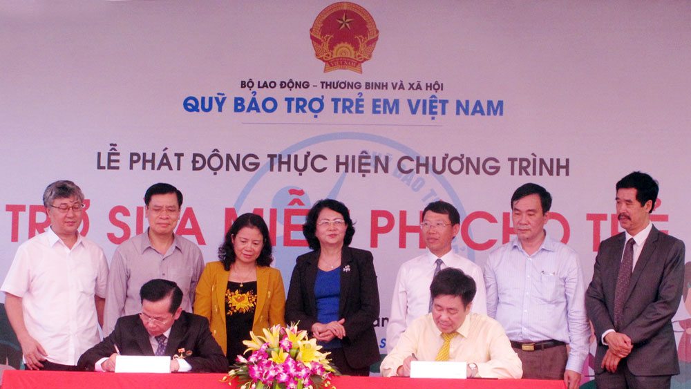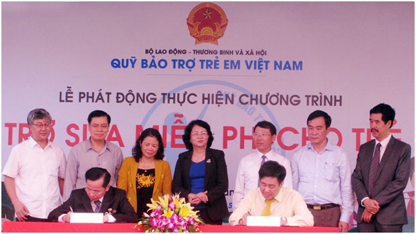 Phó Chủ tịch nước Đặng Thị Ngọc Thịnh và các đại biểu chứng kiến lễ ký thỏa thuận tài trợ Chương trình "Hỗ trợ sữa miễn phí cho trẻ em tiểu học".