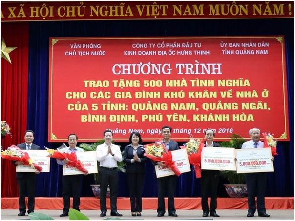 Chiều 16/12, tại thành phố Tam Kỳ, tỉnh Quảng Nam, Văn phòng Chủ tịch nước, Ủy ban Nhân dân tỉnh Quảng Nam và Công ty cổ phần đầu tư kinh doanh địa ốc Hưng Thịnh tổ chức trao kinh phí hỗ trợ xây 500 ngôi nhà tình nghĩa cho các gia đình khó khăn về nhà ở của năm tỉnh Quảng Nam, Quảng Ngãi, Bình Định, Phú Yên, Khánh Hòa.