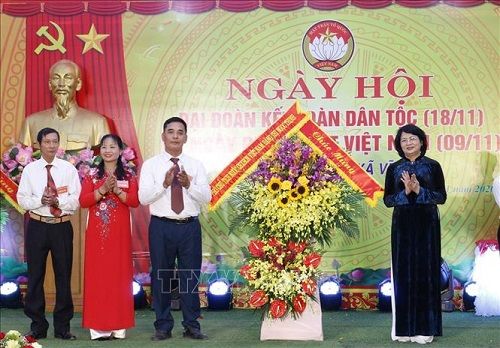 Phó Chủ tịch nước tặng hoa, chúc mừng Ngày hội Đại đoàn kết toàn dân tộc ở khu 11, xã Vĩnh Lại. Ảnh: TTXVN