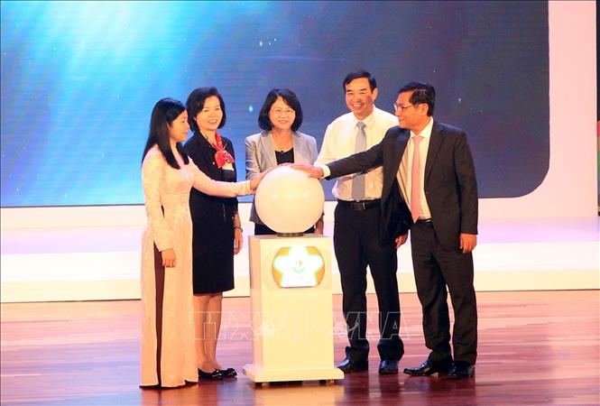 Phó Chủ tịch nước Đặng Thị Ngọc Thịnh và các đại biểu thực hiện nghi thức phát động chương trình Sữa học đường cho trẻ em ở Đà Nẵng.
