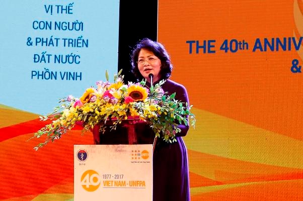 Phát biểu tại buổi lễ, Phó Chủ tịch nước Đặng Thị Ngọc Thịnh đã biểu dương Bộ Y tế cùng các cơ quan và đội ngũ cán bộ, chuyên viên ngành dân số qua các thời kỳ, các tổ chức cá nhân trong cả nước đã tích cực đồng hành tham gia củng cố phát triển mối quan hệ hợp tác giữa Việt Nam và Quỹ Dân số Liên hợp quốc, góp phần vào sự thành công của công tác dân số - kế hoạch hóa gia đình của Việt Nam trong suốt 40 năm qua.