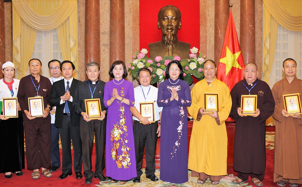 Phó Chủ tịch nước Đặng Thị Ngọc Thịnh trao tặng các đại biểu bức ảnh chân dung Chủ tịch Hồ Chí Minh. (Ảnh: VPCTN/Công Gôn)