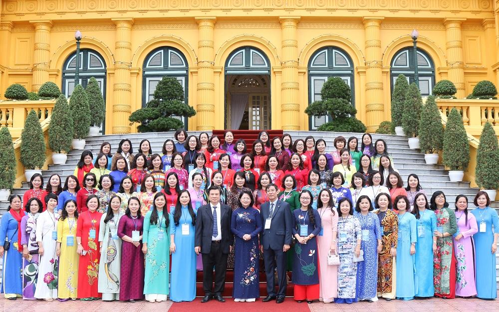 Phó Chủ tịch nước Đặng Thị Ngọc Thịnh chụp ảnh lưu niệm với các đại biểu. (Ảnh: VPCTN/Công Gôn)