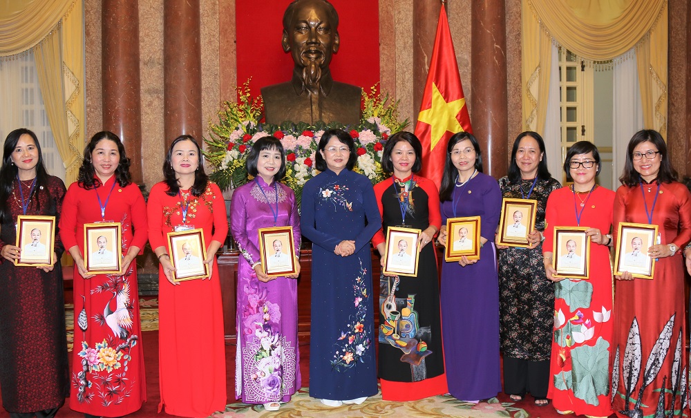 Phó Chủ tịch nước Đặng Thị Ngọc Thịnh trao tặng các đại biểu bức ảnh chân dung Chủ tịch Hồ Chí Minh. (Ảnh: VPCTN/Công Gôn)