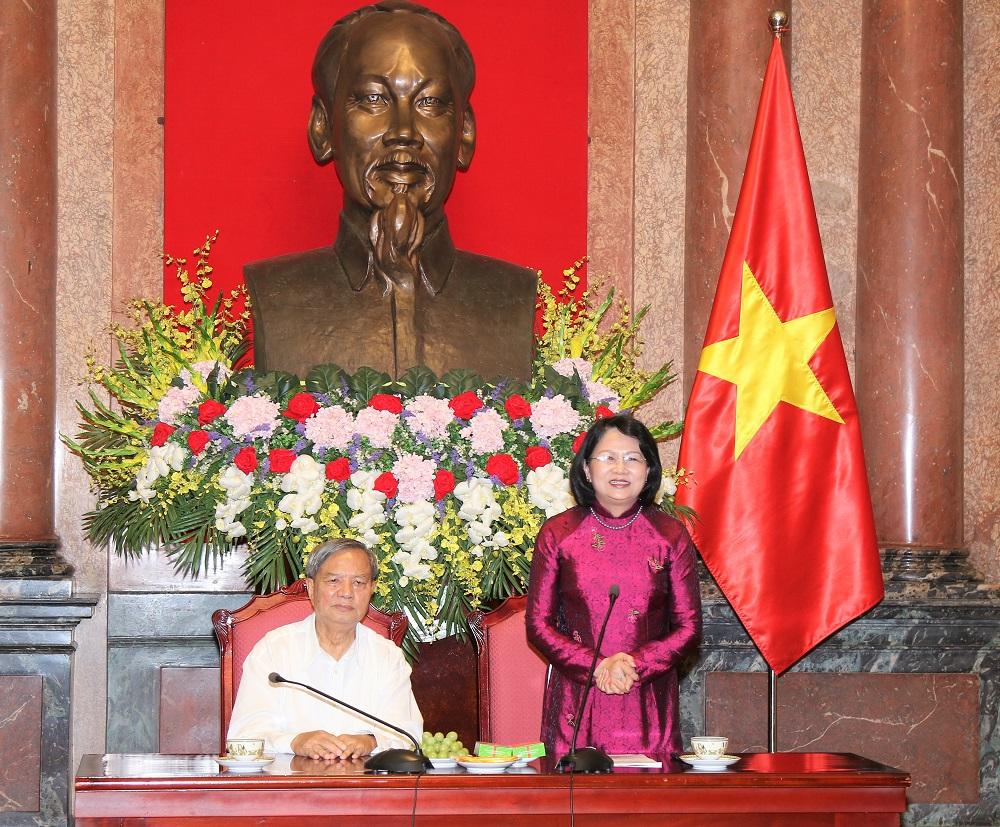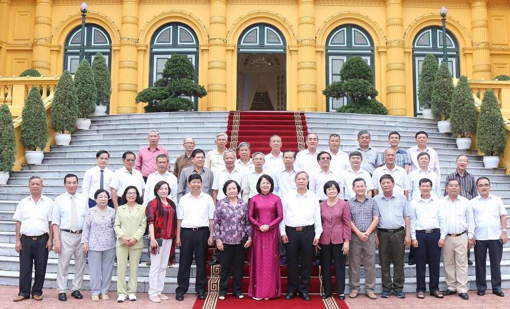 Phó Chủ tịch nước Đặng Thị Ngọc Thịnh chụp ảnh lưu niệm với các thành viên dự cuộc gặp mặt. (Ảnh: VPCTN/Công Gôn)