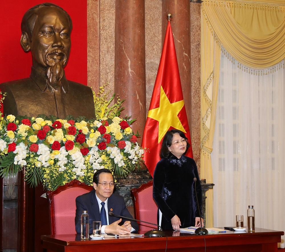 Phó Chủ tịch nước, Chủ tịch Hội đồng bảo trợ Quỹ Bảo trợ trẻ em Việt Nam Đặng Thị Ngọc Thịnh phát biểu tại cuộc gặp mặt. (Ảnh:VPCTN/Công Gôn)