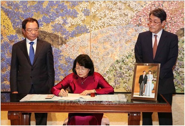 Phó Chủ tịch nước Đặng Thị Ngọc Thịnh ghi sổ chúc mừng Nhà vua Nhật Bản Naruhito đăng cơ. Ảnh: Văn Điệp/TTXVN