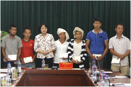 Nhân dịp này, Phó Chủ nước Đặng Thị Ngọc Thịnh đã trao tiền hỗ trợ của cán bộ, nhân viên Văn phòng Chủ tịch nước cho 15 hộ có người bị chết và mất tích, 15 hộ có người bị thương trong cơn lũ vừa qua tại xã Nặm Păm.