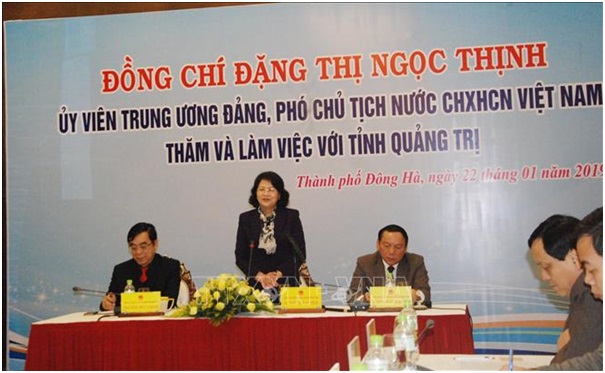 Phát biểu tại buổi làm việc, Phó Chủ tịch nước Đặng Thị Ngọc Thịnh ghi nhận, đánh giá cao những kết quả mà tỉnh Quảng Trị đã đạt được trong thời gian qua; đồng thời tin tưởng tỉnh sẽ sớm vượt qua những khó khăn, thách thức để hoàn thành những chỉ tiêu đã đề ra trong năm 2019. Phó Chủ tịch nước nhấn mạnh: Tỉnh Quảng Trị cần tiếp tục tập trung chỉ đạo thực hiện ba phong trào thi đua yêu nước mà Chính phủ đã phát động. Đặc biệt, tỉnh tập trung thu hút, tạo điều kiện tốt cho các doanh nghiệp của tỉnh để kinh tế tư nhân, kinh tế đầu tư nước ngoài cùng với kinh tế nhà nước trở thành động lực đưa kinh tế ngày càng phát triển nhanh hơn, bền vững hơn trong thời gian tới. Bên cạnh đó, tỉnh tiếp tục quan tâm thực hiện tốt chính sách xóa đói giảm nghèo; tuyên truyền, vận động người dân quan tâm vận động người dân có ý thức tự vươn lên, tự thoát nghèo.