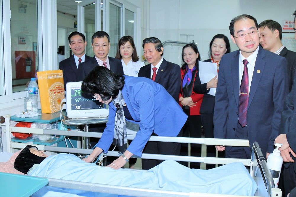 Phó Chủ tịch nước Đặng Thị Ngọc Thịnh thăm, tặng quà bệnh nhân đang điều trị tại bệnh viện. (Ảnh: Công Gôn/VPCTN)