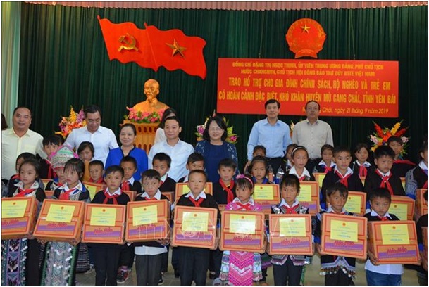 Phó Chủ tịch nước cũng trao tặng Quỹ Bảo trợ trẻ em tỉnh Yên Bái 300 triệu đồng, Quỹ vì người nghèo của huyện Mù Cang Chải 50 triệu đồng, 50 suất quà cho các hộ gia đình chính sách, hộ nghèo của xã Lao Chải và Mồ Dề mỗi suất 1 triệu đồng và 1 phần quà trị giá 300.000 đồng; trao 100 suất học bổng cho 100 em học sinh có hoàn cảnh đặc biệt khó khăn của 4 xã Chế Cu Nha, Lao Chải, Mồ Dề và Kim Nọi mỗi suất trị giá 1 triệu đồng.