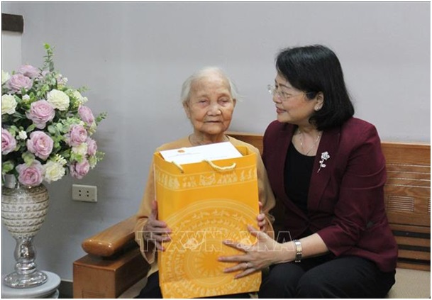 Phó Chủ tịch nước tặng quà cho gia đình bà Trần Thị Phương (tổ 18, phường Túc Duyên, thành phố Thái Nguyên) là vợ Liệt sĩ công an Ngô Văn Thỉnh. Ảnh: Quân Trang/TTXVN