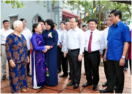 Phó Chủ tịch nước Đặng Thị Ngọc Thịnh trò chuyện với nhân chứng lịch sử ở xã Nguyên Hòa (Phù Cừ)
