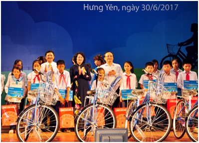 * Phó Chủ tịch nước cũng đã đến dự Lễ trao tặng xe đạp và học bổng cho trẻ em hiếu học có hoàn cảnh khó khăn của tỉnh Hưng Yên. Đây là hoạt động do Quỹ Bảo trợ Trẻ em Việt Nam (BTTEVN), Bảo Việt Nhân thọ phối hợp với Sở Lao động, Thương binh và Xã hội Hưng Yên tổ chức, là sự kiện tiếp nối chặng hành trình trao tặng 1.700 xe đạp và 1.700 chiếc ba lô với tổng giá trị 3,6 tỷ đồng trong chương trình học bổng “An sinh giáo dục-xe đạp đến trường - 2017” của Quỹ BTTEVN và Bảo Việt Nhân thọ thực hiện trên toàn quốc.