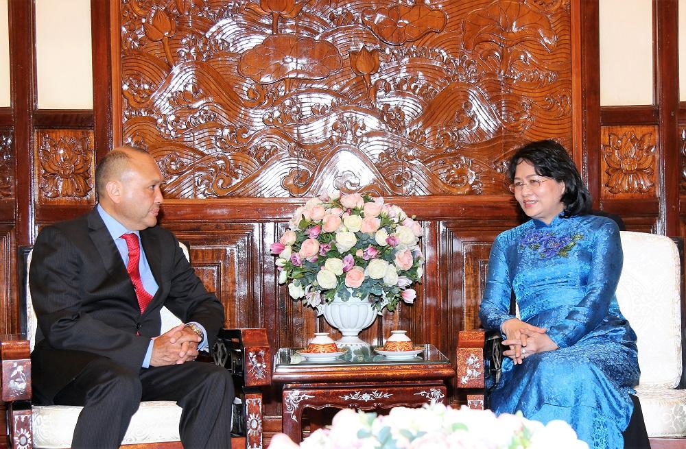 Phó Chủ tịch nước Đặng Thị Ngọc Thịnh tiếp Đại sứ Beketzhan Zhumakhanov. (Ảnh: VPCTN/Công Gôn)
