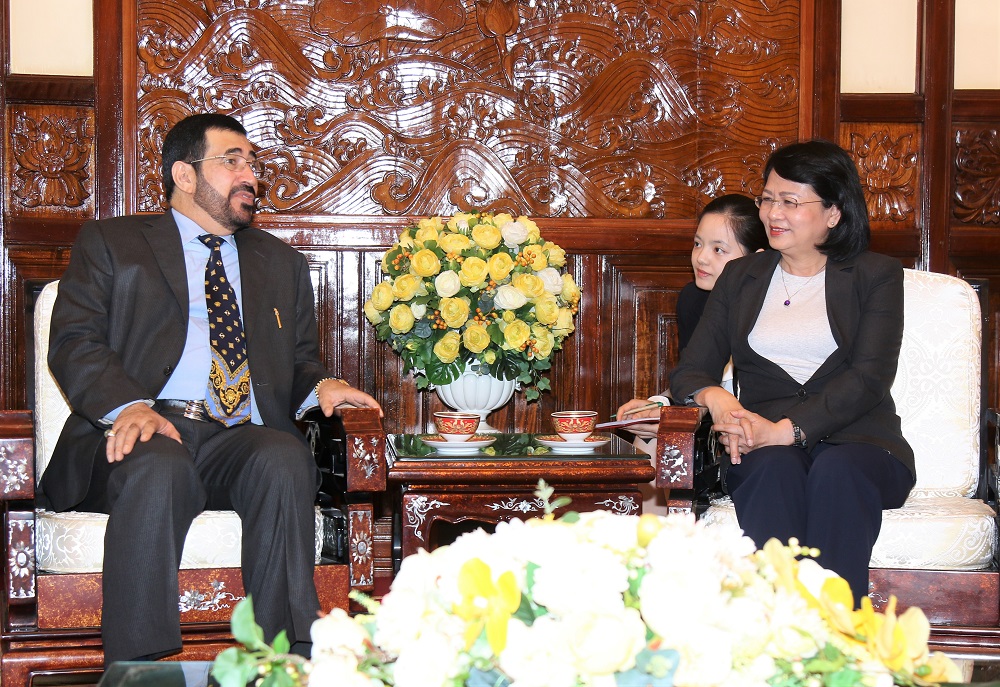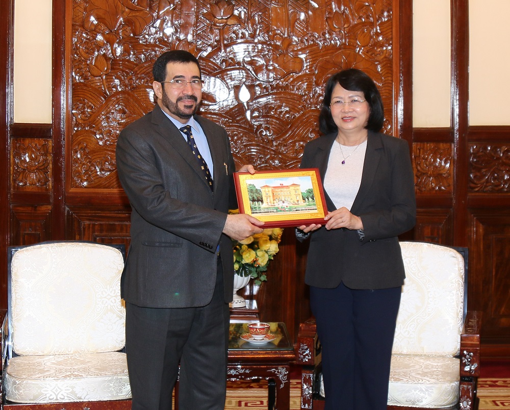 Phó Chủ tịch nước bày tỏ vui mừng trước những bước phát triển của quan hệ hợp tác giữa hai nước trong thời gian qua. Oman hiện là một trong những đối tác quan trọng của Việt Nam ở khu vực Trung Đông, thành công này có sự đóng góp tích cực của ngài Đại sứ. Về chính trị, ngài Đại sứ đã tích cực thúc đẩy các kỳ họp Ủy ban hỗn hợp Việt Nam - Oman cấp Bộ trưởng và các kỳ họp Tham vấn chính trị cấp Thứ trưởng giữa hai Bộ Ngoại giao. Ngài Đại sứ cũng tích cực thúc đẩy các hoạt động thương mại, vận động doanh nghiệp Oman tìm hiểu thị trường Việt Nam, góp phần đưa kim ngạch thương mại song phương tăng đều trong thời gian qua. Phó Chủ tịch nước mong muốn hai bên tiếp tục triển khai có hiệu quả các nội dung đã thống nhất, đẩy mạnh trao đổi đoàn doanh nghiệp và hoạt động xúc tiến thương mại để tăng cường hợp tác thương mại, đầu tư giữa hai nước trên các lĩnh vực mà hai bên có thế mạnh trong thời gian tới.