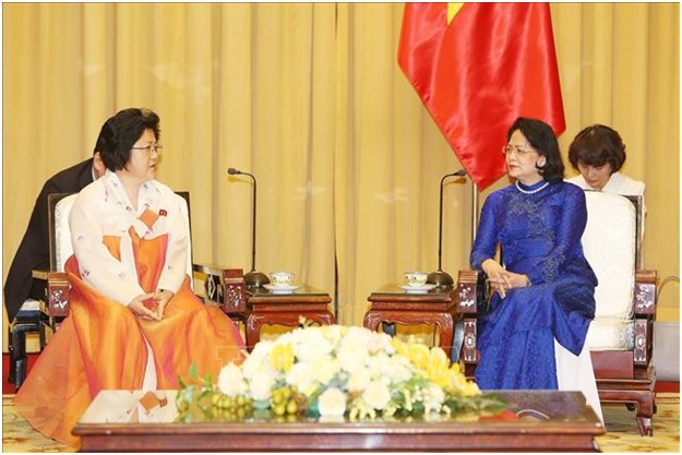 Phó Chủ tịch nước Đặng Thị Ngọc Thịnh tiếp đồng chí Ri Kang-juk, Phó Chủ tịch Hội Hữu nghị Triều Tiên - Việt Nam. Ảnh: Dương Giang/TTXVN