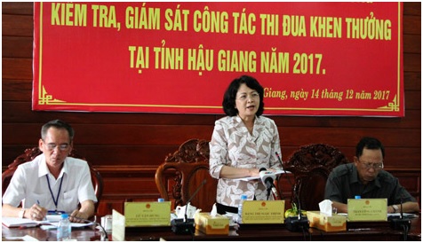 Sáng ngày 14-12, Đoàn công tác của Hội đồng Thi đua - Khen thưởng (TĐKT) Trung ương do Phó Chủ tịch nước Đặng Thị Ngọc Thịnh, Phó Chủ tịch thứ nhất Hội đồng TĐKT Trung ương, làm Trưởng đoàn đã đến kiểm tra, giám sát công tác thi đua - khen thưởng tại tỉnh Hậu Giang năm 2017. Tiếp và làm việc với đoàn có ông Trần Công Chánh, Bí thư Tỉnh ủy; ông Lữ Văn Hùng, Chủ tịch UBND tỉnh, Chủ tịch Hội đồng TĐKT tỉnh Hậu Giang.