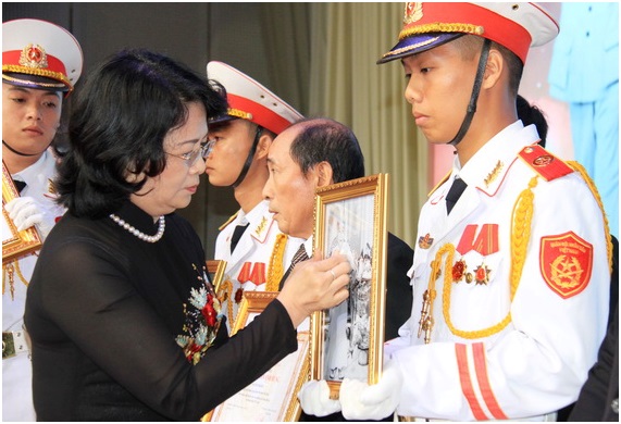 Phó chủ tịch nước Đặng Thị Ngọc Thịnh trao danh hiệu cao quý của Đảng và Nhà nước tặng Bà Mẹ Việt Nam Anh hùng (thân nhân của Mẹ đón nhận)