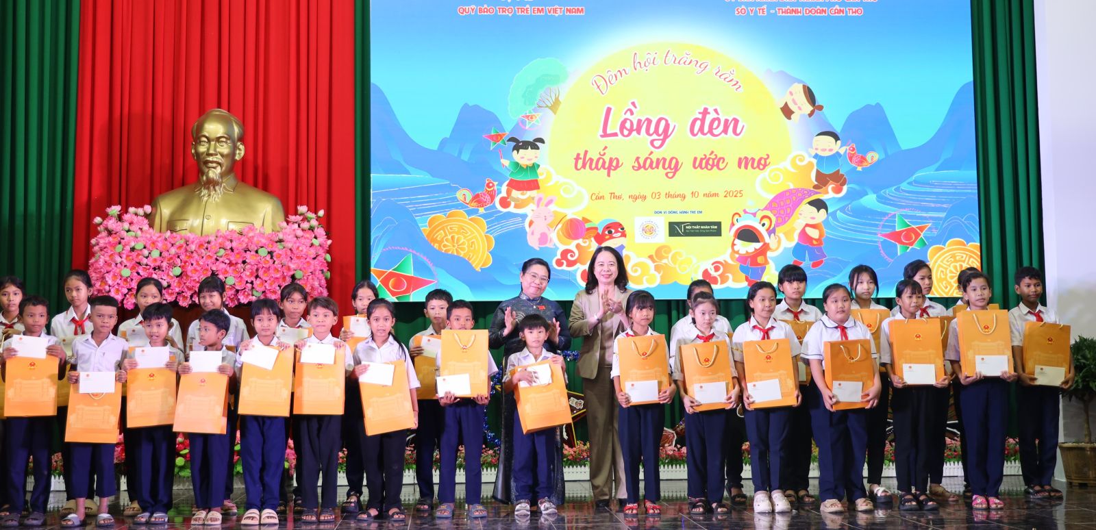 Trước đó, vào chiều 3/10, Phó Chủ tịch nước cùng Đoàn công tác Trung ương đến thăm, tặng quà Tết Trung thu cho trẻ em đang điều trị bệnh tại Bệnh viện Ung bướu thành phố Cần Thơ. Tại đây, Phó Chủ tịch nước Võ Thị Ánh Xuân gửi lời thăm hỏi, động viên, chúc mừng tốt đẹp nhất nhân dịp Tết Trung thu đến gia đình, trẻ em đang điều trị, cùng đội ngũ y, bác sĩ, điều dưỡng Bệnh viện Ung bướu, trao 30 phần quà cho các em đang điều trị và tặng quà đội ngũ y, bác sĩ Khoa Ngoại tổng hợp.