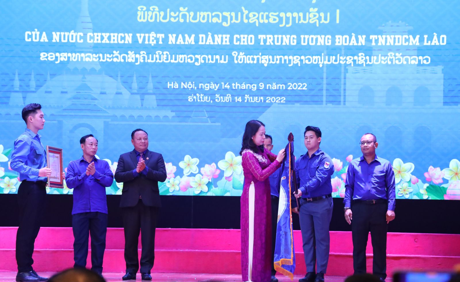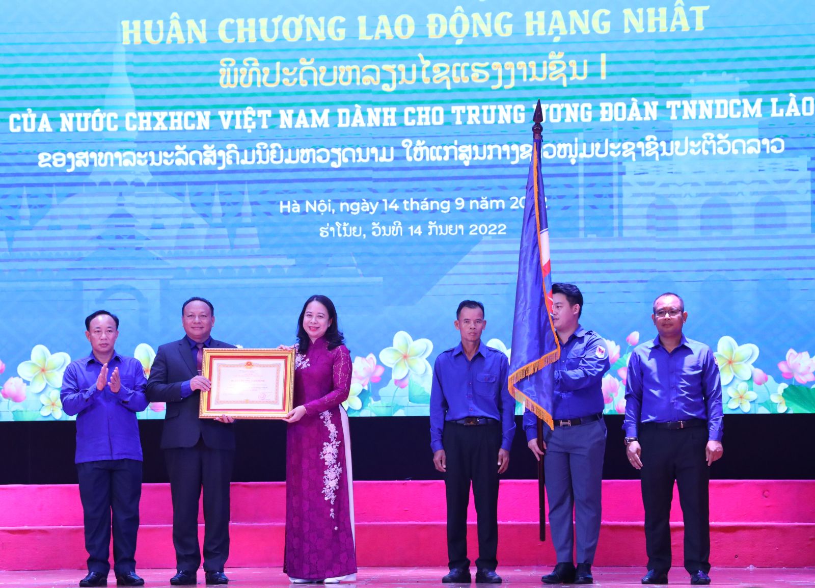 Phó Chủ tịch nước trao Huân chương Lao động hạng Nhất cho Trung ương Đoàn Thanh niên Nhân dân Cách mạng Lào. Ảnh: VPCTN