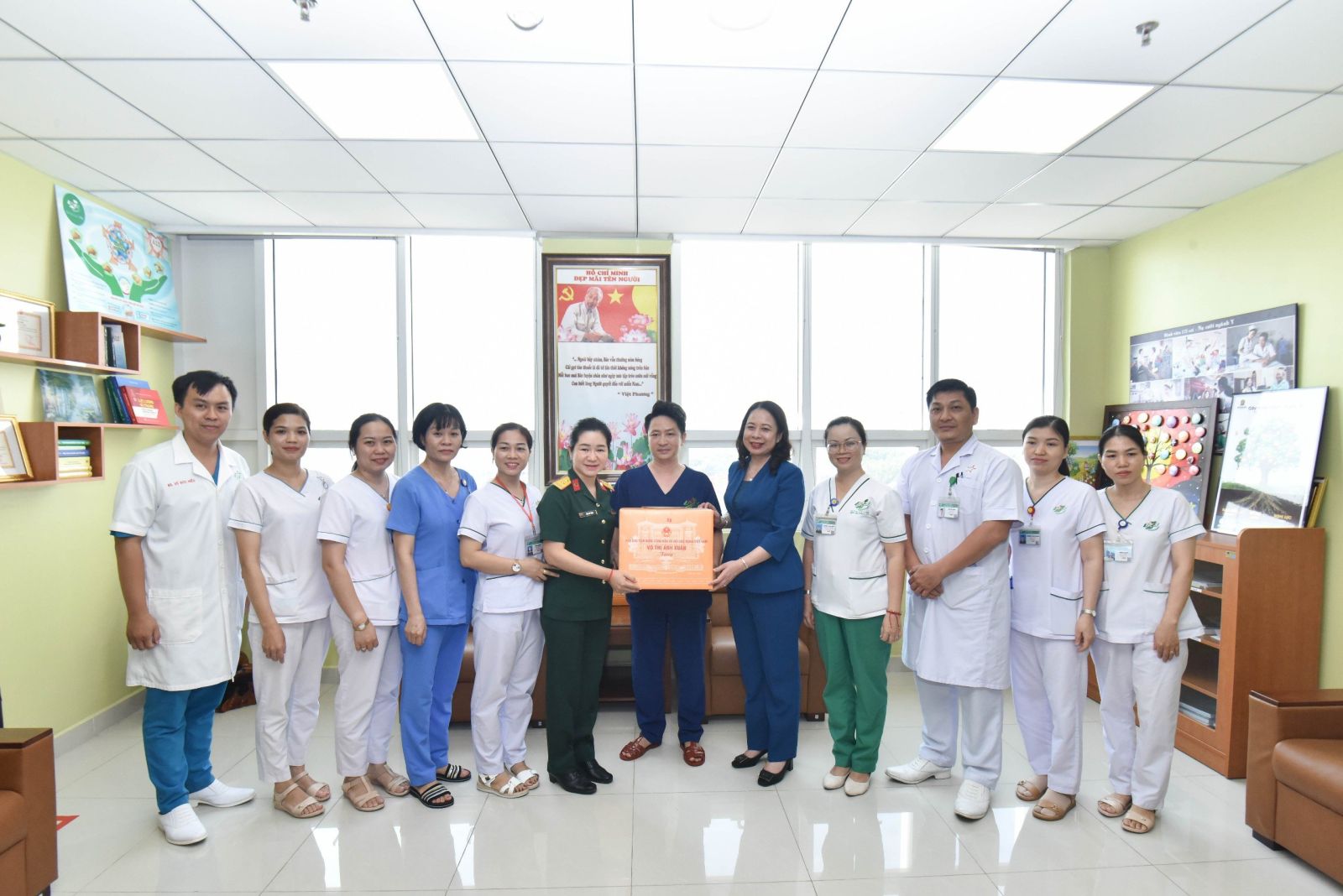 Phó Chủ tịch nước Võ Thị Ánh Xuân tặng quà tập thể lãnh đạo, y bác sĩ Bệnh viện Thống Nhất TP Hồ Chí Minh. Ảnh: VPCTN