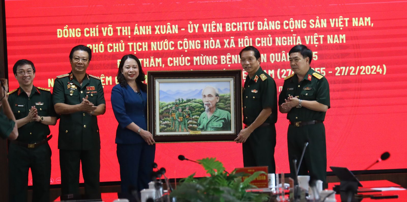 Phó Chủ tịch nước Võ Thị Ánh Xuân chúc mừng tập thể lãnh đạo, y bác sĩ Bệnh viện Quân y 175, TP Hồ Chí Minh. Ảnh: VPCTN