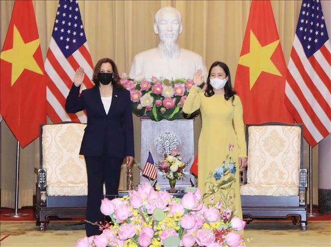 Phó Chủ tịch nước Võ Thị Ánh Xuân tiếp Phó Tổng thống Hoa Kỳ Kamala Harris. Ảnh: Trọng Đức/TTXVN