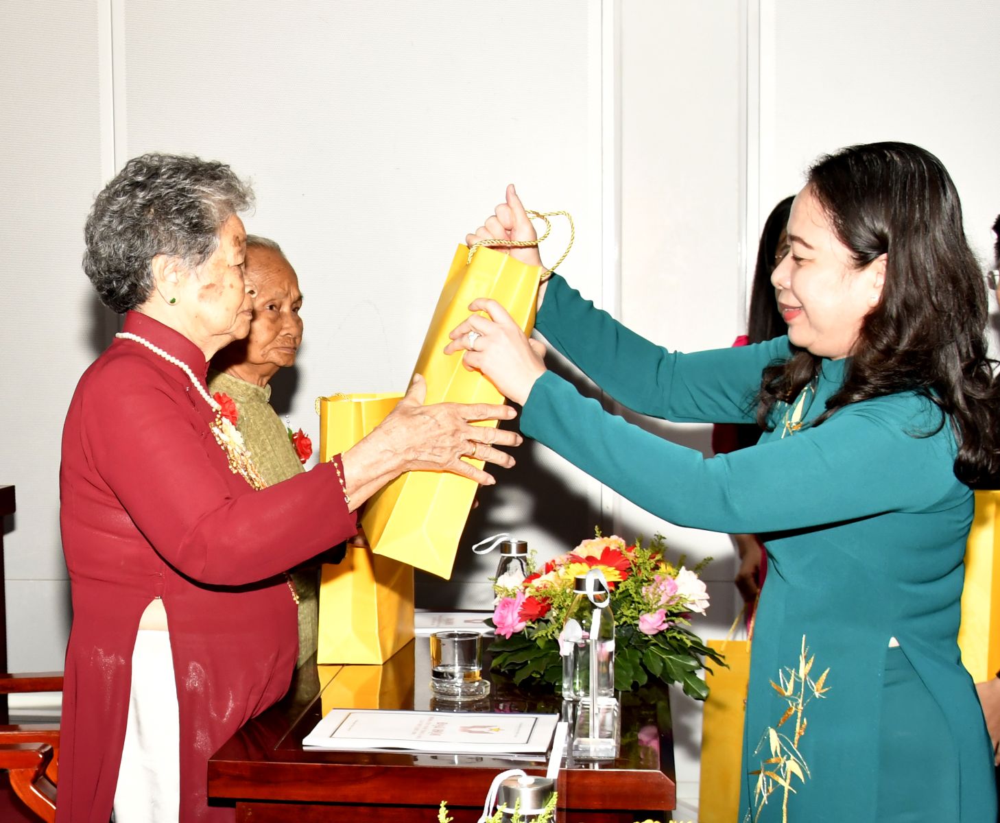 Phó Chủ tịch nước tặng quà Mẹ Việt Nam Anh hùng tại Đại hội. Ảnh: VPCTN