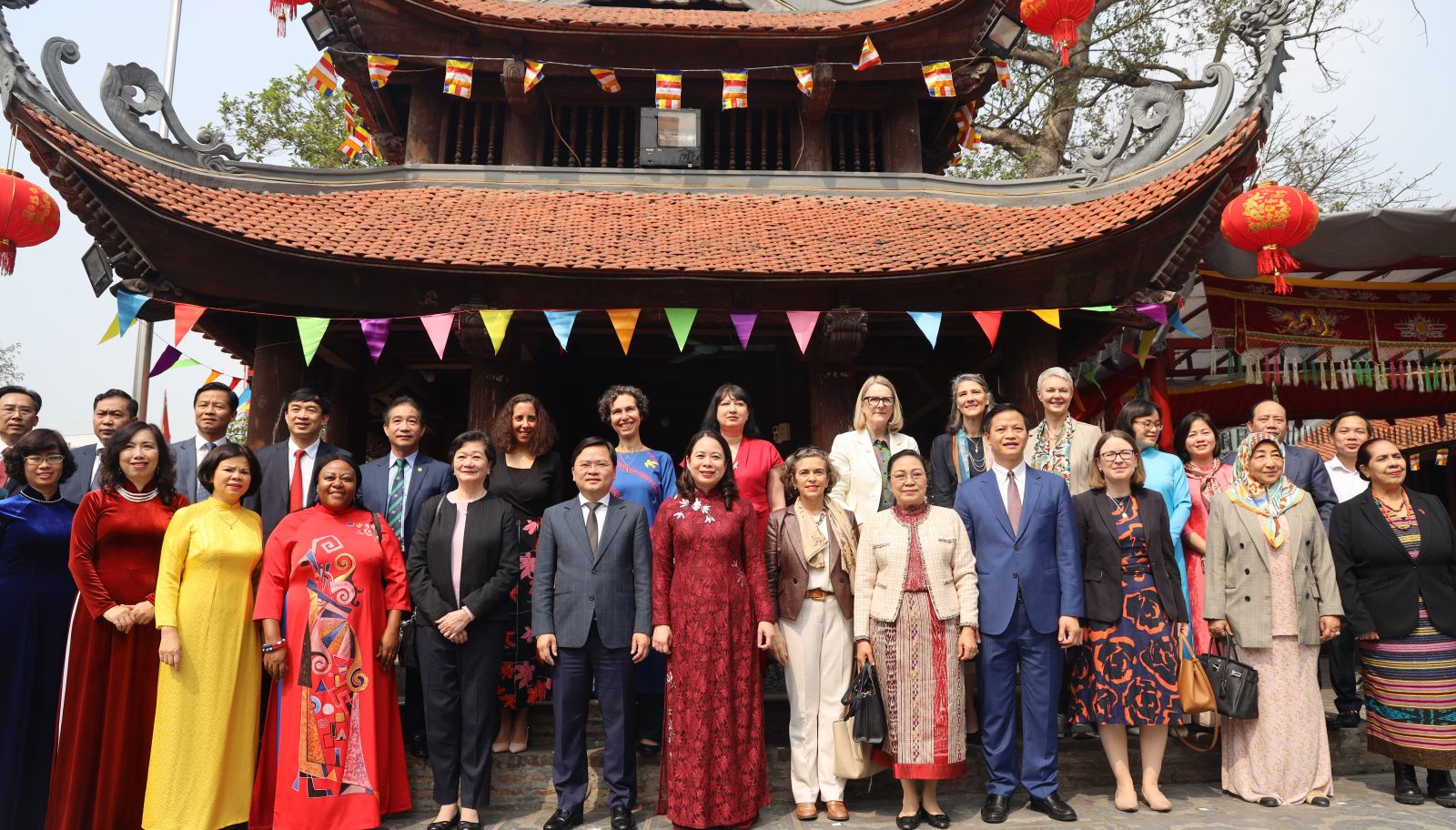 Phó Chủ tịch nước Võ Thị Ánh Xuân với các nữ Đại sứ, Trưởng đại diện các tổ chức quốc tế tại Việt Nam tại đình làng Đồng Kỵ, Từ Sơn, Bắc Ninh. Ảnh: VPCTN