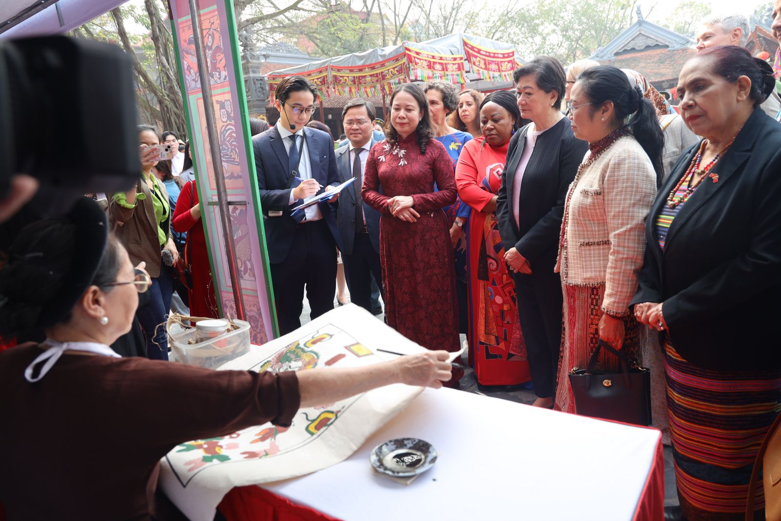 Phó Chủ tịch nước và các nữ Đại sứ, Trưởng đại diện các tổ chức quốc tế tại Việt Nam tìm hiểu nghệ thuật làm tranh Đông Hồ tại làng Đồng Kỵ, Từ Sơn, Bắc Ninh. Ảnh: VPCTN