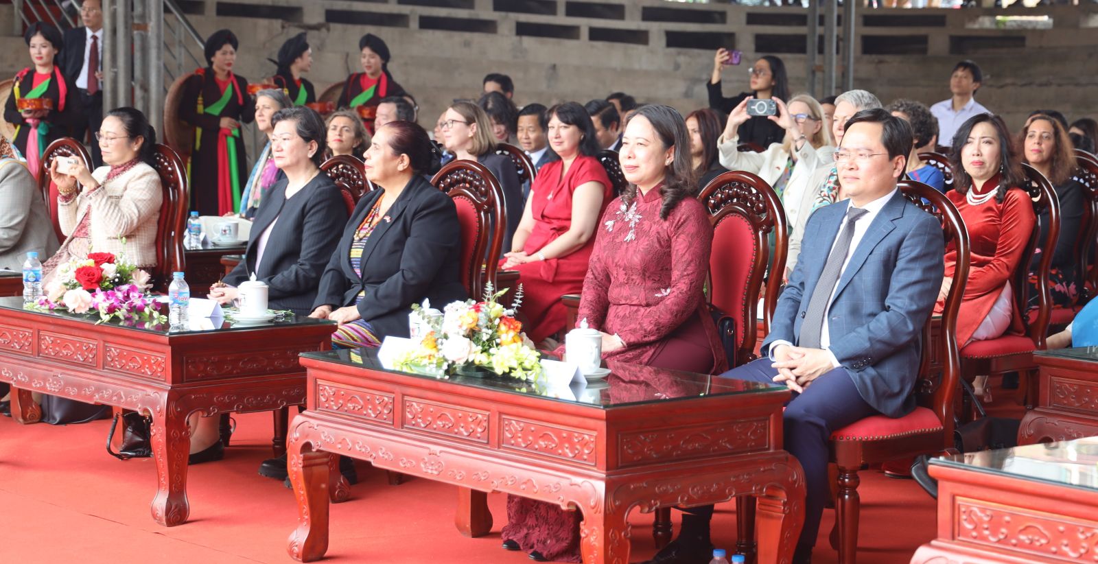Phó Chủ tịch nước và các nữ Đại sứ, Trưởng đại diện các tổ chức quốc tế tại Việt Nam thưởng thức quan họ tại làng Đồng Kỵ, Từ Sơn, Bắc Ninh. Ảnh: VPCTN