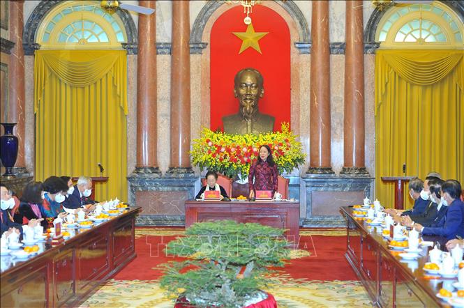 Phó Chủ tịch nước Võ Thị Ánh Xuân phát biểu tại buổi gặp mặt. Ảnh: Minh Đức/TTXVN