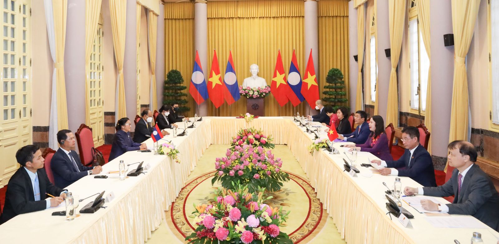 Trước những diễn biến phức tạp hiện nay trên thế giới, hai Phó Chủ tịch nước nhấn mạnh ý nghĩa và giá trị của việc vun đắp và không ngừng củng cố mối quan hệ láng giềng hữu nghị gắn bó, tình đoàn kết đặc biệt Việt Nam - Lào đối với an ninh và phát triển của mỗi nước, cũng như hoà bình, ổn định và hợp tác ở khu vực. Hai bên vui mừng về những bước phát triển mới trong quan hệ hợp tác giữa hai nước thời gian qua trên tất cả các lĩnh vực. Vượt qua những khó khăn, cản trở do dịch bệnh, hai bên đã cùng nỗ lực duy trì thường xuyên các hoạt động trao đổi đoàn, tiếp xúc cấp cao, phát huy hiệu quả các cơ chế hợp tác song phương quan trọng, thực hiện tốt các thỏa thuận và kế hoạch hợp tác trên tất cả các lĩnh vực quan trọng. Hợp tác kinh tế giữa hai nước giữ được đà phát triển khả quan. Trong 3 tháng đầu năm 2022 kim ngạch thương mại hai chiều đạt 403,6 triệu USD, tăng 19,22% so với cùng kỳ năm 2021. Việt Nam hiện có 214 dự án đầu tư còn hiệu lực vào Lào, với tổng vốn đăng ký khoảng 5,33 tỷ USD, tiếp tục là một trong những nước đầu tư trực tiếp lớn nhất tại Lào.