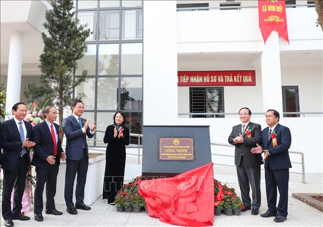 Phó Chủ tịch nước Đặng Thị Ngọc Thịnh và các đại biểu gắn biển công trình trụ sở Đảng ủy, HĐND, UBND xã Ninh Hiệp