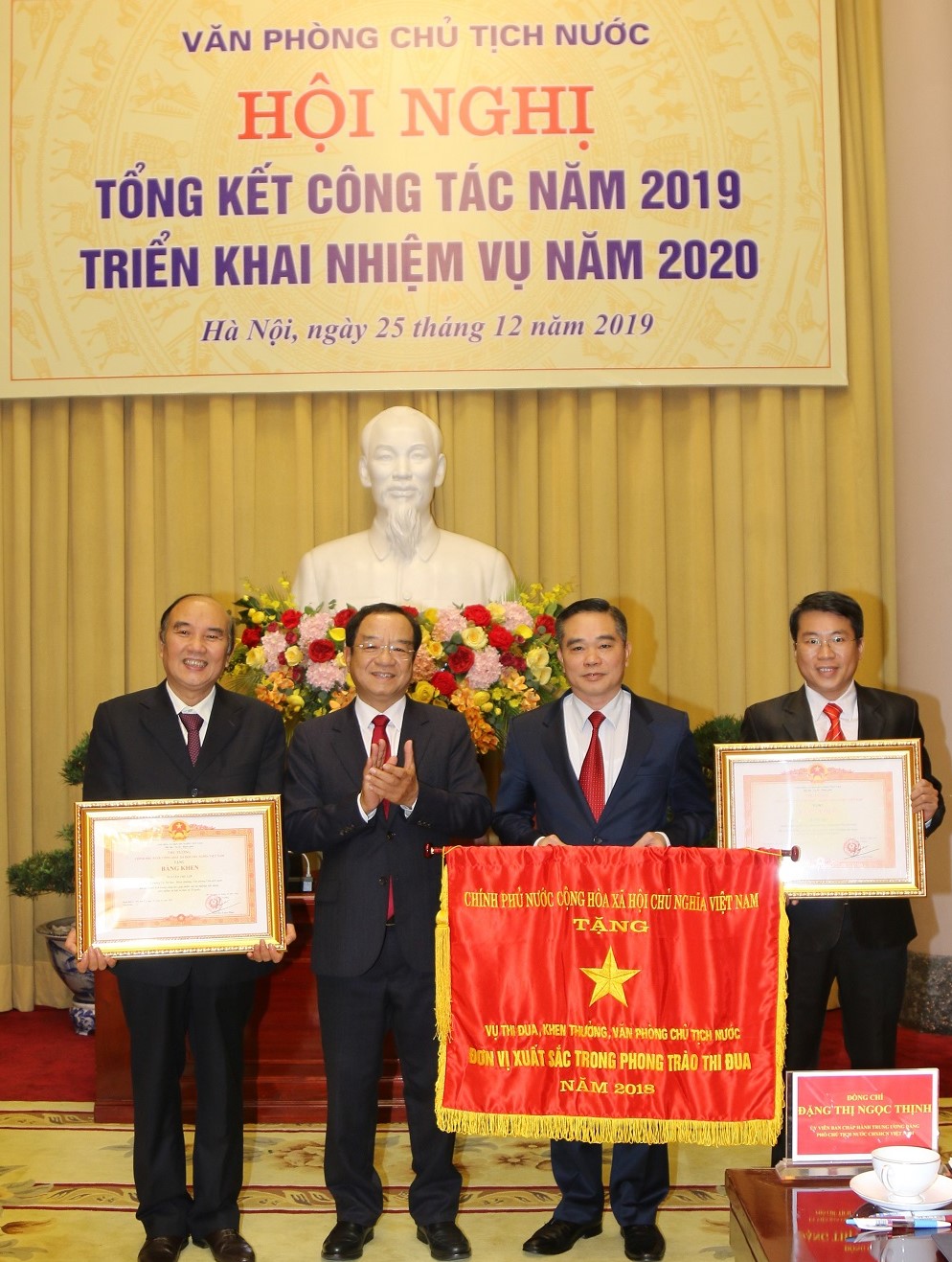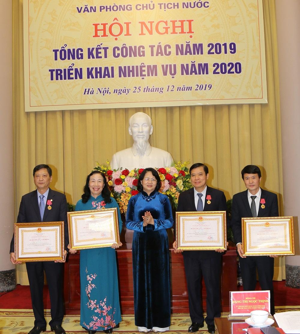 Nhân dịp này, Phó Chủ tịch nước Đặng Thị Ngọc Thịnh thay mặt lãnh đạo Đảng, Nhà nước đã trao Huân chương Lao động hạng Nhất tặng đồng chí Chu Văn Yêm, Phó Chủ nhiệm Văn phòng Chủ tịch nước và đồng chí Nguyễn Thị Dung, Trợ lý Phó Chủ tịch nước; trao Huân chương Lao động hạng Nhì và Huân chương Lao động hạng Ba tặng đồng chí Lê Trọng Nghĩa và đồng chí Nguyễn Ngọc Hà. Thừa ủy quyền của Thủ tướng Nguyễn Xuân Phúc, Chủ nhiệm Văn phòng Chủ tịch nước Đào Việt Trung đã trao Cờ thi đua của Chính phủ tặng Vụ Thi đua - Khen thưởng Văn phòng Chủ tịch nước; trao Bằng khen của Thủ tướng Chính phủ tặng đồng chí Nguyễn Thế Lợi và đồng chí Lê Đức Thọ.