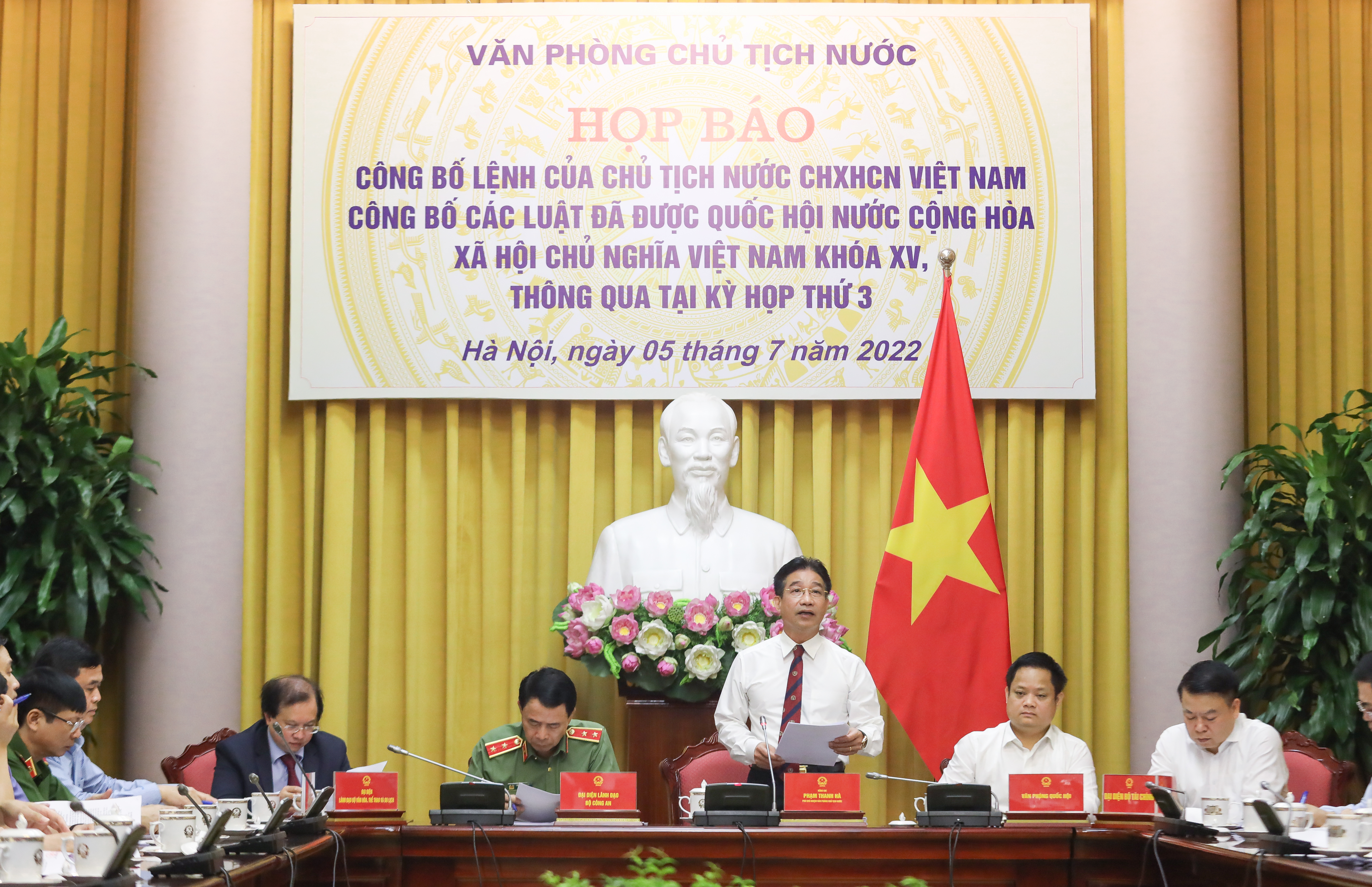 Tại buổi họp báo, đ/c Phạm Thanh Hà, Phó Chủ nhiệm Văn phòng Chủ tịch nước Công bố Lệnh số 03,04,05,06,07/2022/L-CTN Về việc công bố Luật Cảnh sát cơ động; Luật Thi đua, khen thưởng; Luật Điện ảnh; Luật Kinh doanh Bảo hiểm; Luật sửa đổi, bổ sung một số điều của Luật Sở hữu trí tuệ; đã được Quốc hội nước Cộng hòa Xã hội chủ nghĩa Việt Nam khóa XV, kỳ họp thứ 3 thông qua.