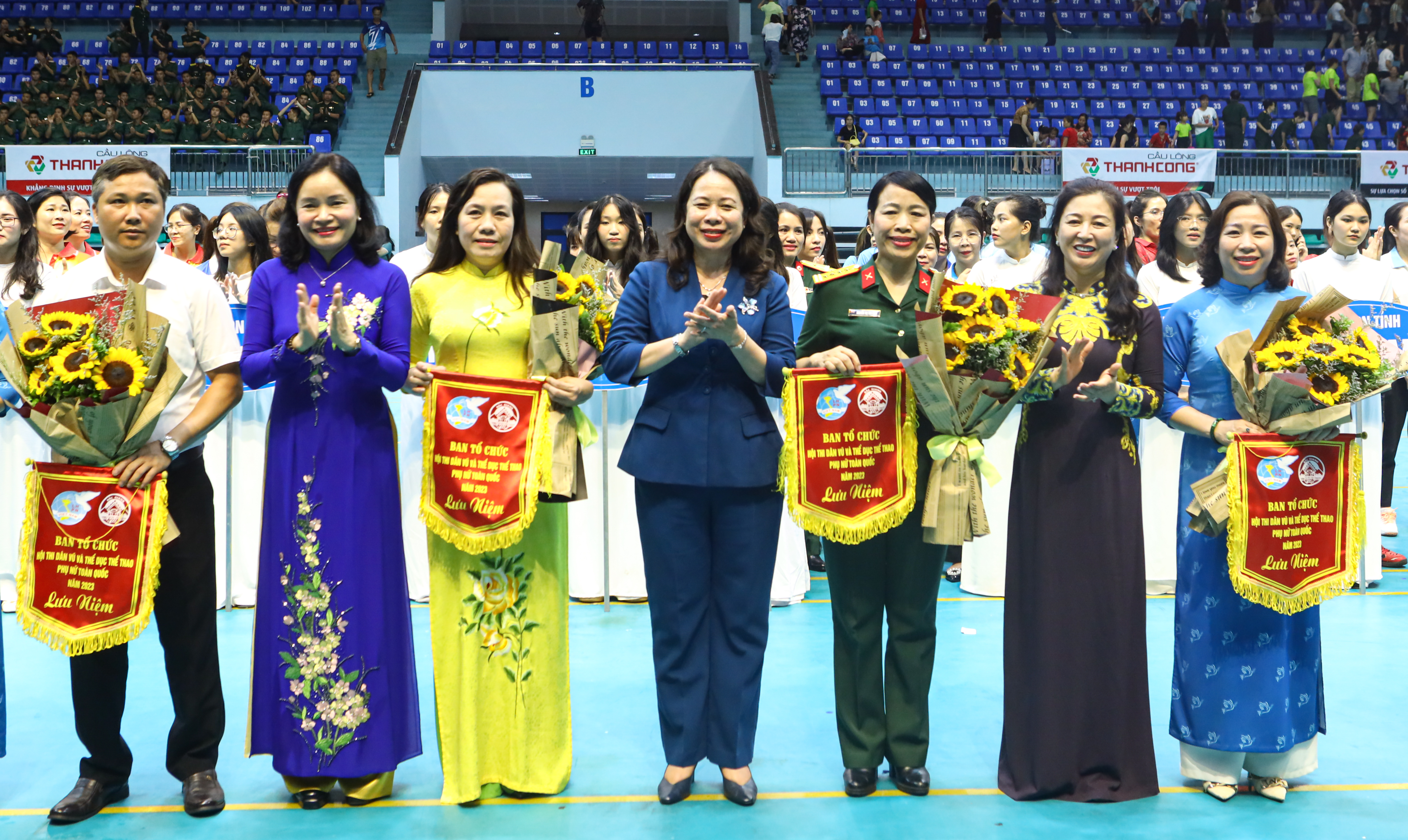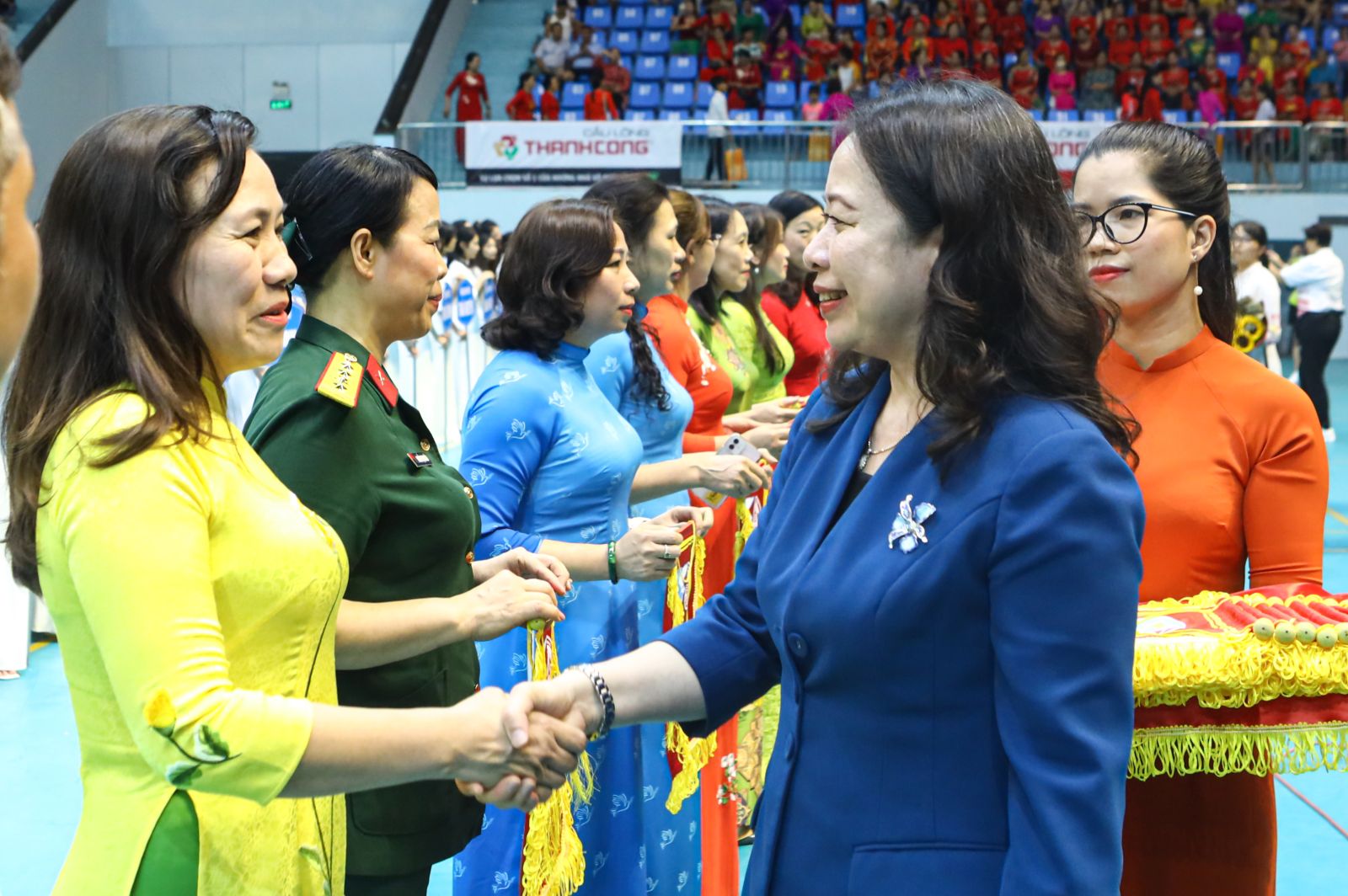 Phó Chủ tịch nước Võ Thị Ánh Xuân trao cờ lưu niệm và hoa cho các đoàn tham gia hội thi. Ảnh: VPCTN