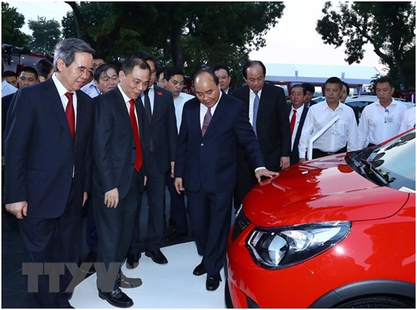 Thủ tướng Nguyễn Xuân Phúc dự lễ phát động "Hàng Việt Nam chinh phục người Việt Nam” và ra mắt xe VinFast của Tập đoàn Vingroup, chiều 20/11/2018. (Ảnh: Thống Nhất/TTXVN)