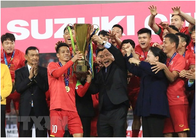Giây phút đăng quang nâng cao cúp vàng vô địch AFF Suzuki Cup 2018 của Đội tuyển bóng đá Việt Nam trong sự chứng kiến và chúc mừng nồng nhiệt của Thủ tướng Nguyễn Xuân Phúc và Chủ tịch Quốc hội Nguyễn Thị Kim Ngân. (Ảnh: Trọng Đạt/TTXVN)