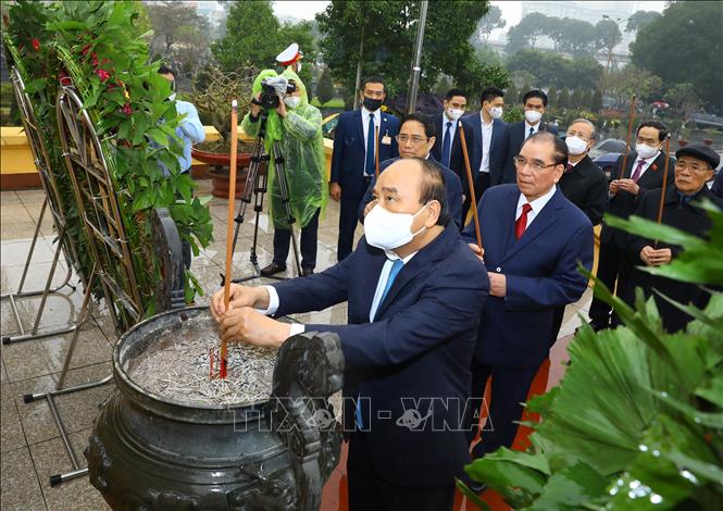 Nguyên Tổng Bí thư Nông Đức Mạnh, Chủ tịch nước Nguyễn Xuân Phúc, Thủ tướng Chính phủ Phạm Minh Chính dâng hương tưởng nhớ các vị tiền bối cách mạng và các Anh hùng, liệt sỹ tại Nghĩa trang Mai Dịch. Ảnh: Văn Điệp/TTXVN