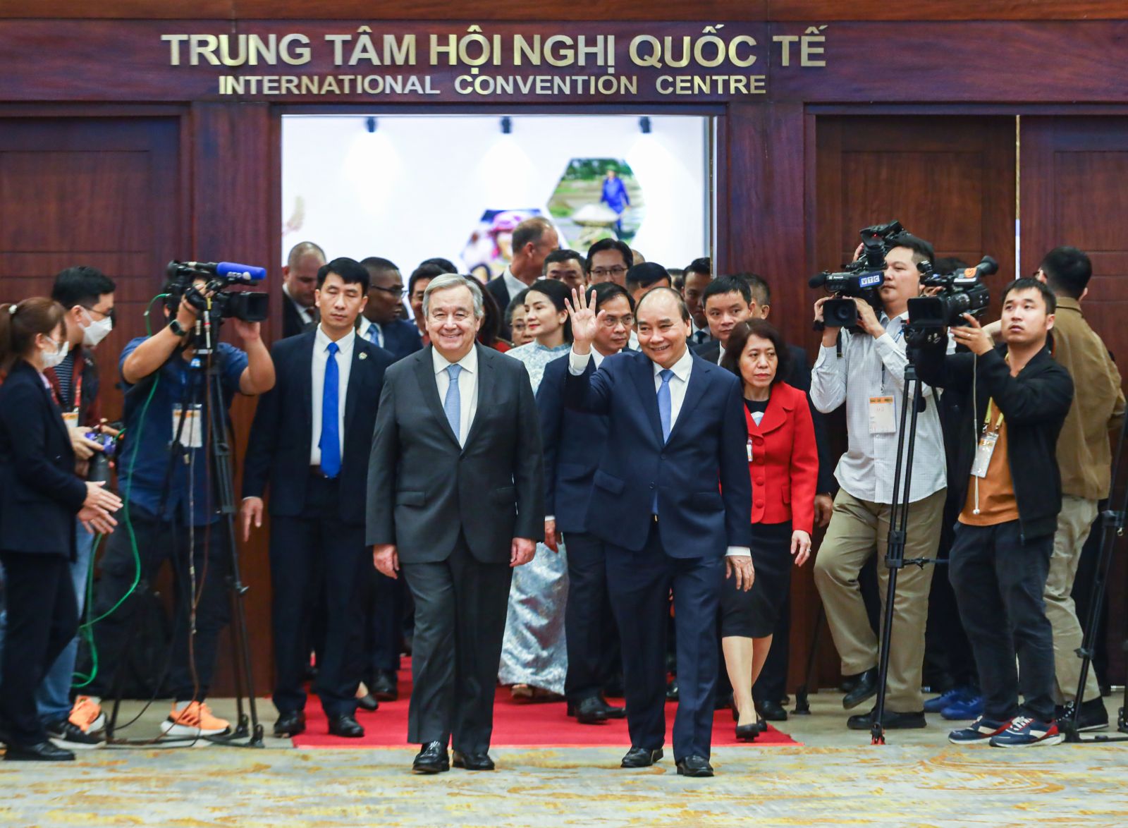 Chủ tịch nước Nguyễn Xuân Phúc và Tổng Thư ký Liên hợp quốc António Guterres tham dự buổi lễ. Ảnh: VPCTN