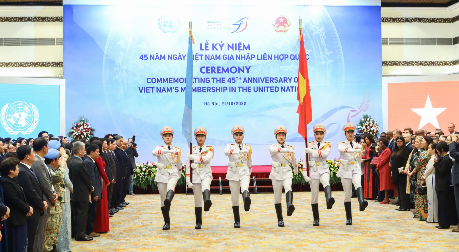 Tiêu binh rước Quốc kỳ Việt Nam và cờ Liên hợp quốc tại lễ kỷ niệm. Ảnh: VPCTN
