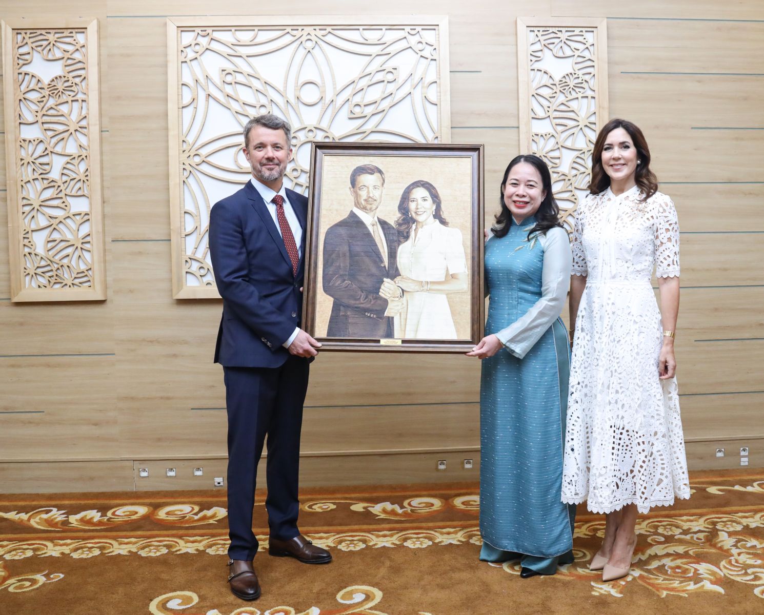 Phó Chủ tịch nước Võ Thị Ánh Xuân tặng quà lưu niệm cho Thái tử kế vị Đan Mạch Frederik và Công nương. Ảnh: VPCTN