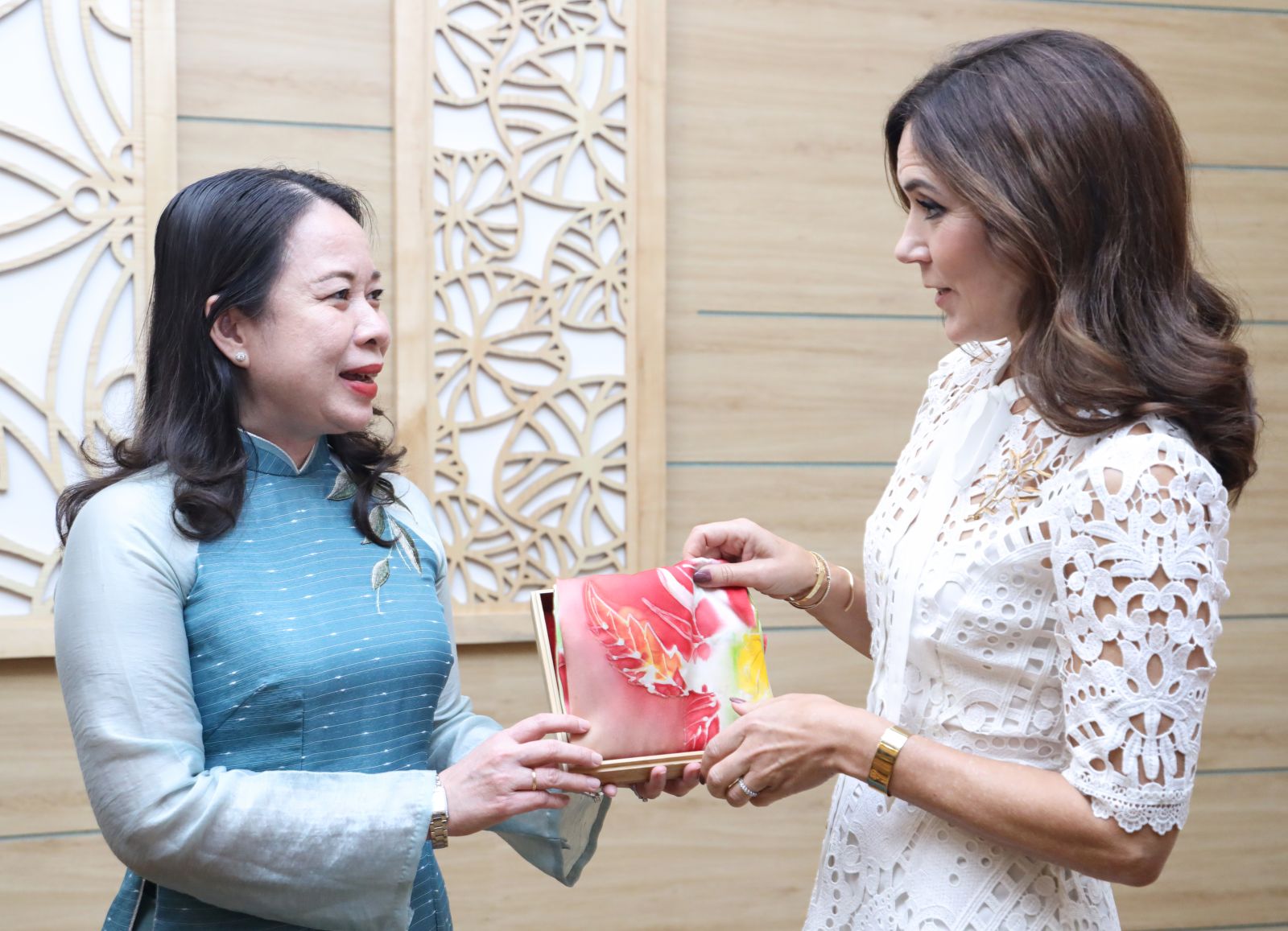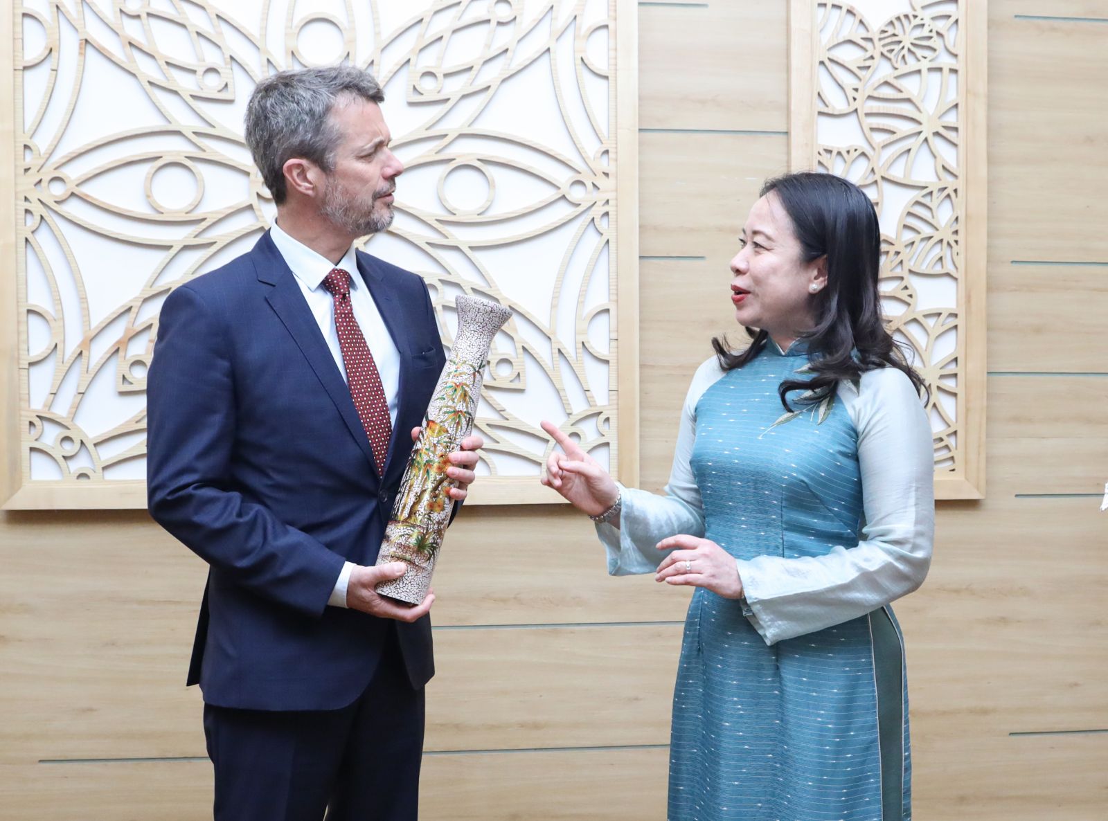 Phó Chủ tịch nước Võ Thị Ánh Xuân tặng quà lưu niệm cho Thái tử kế vị Đan Mạch Frederik. Ảnh: VPCTN